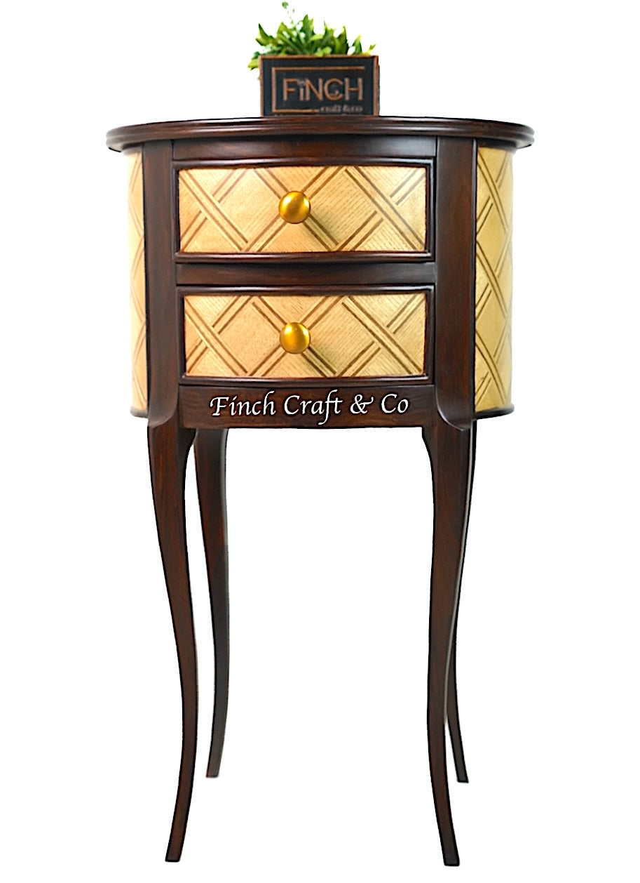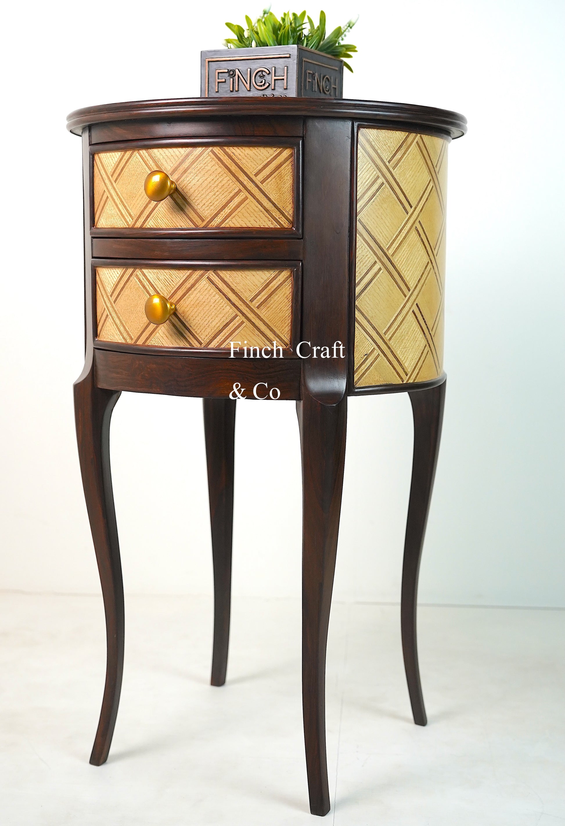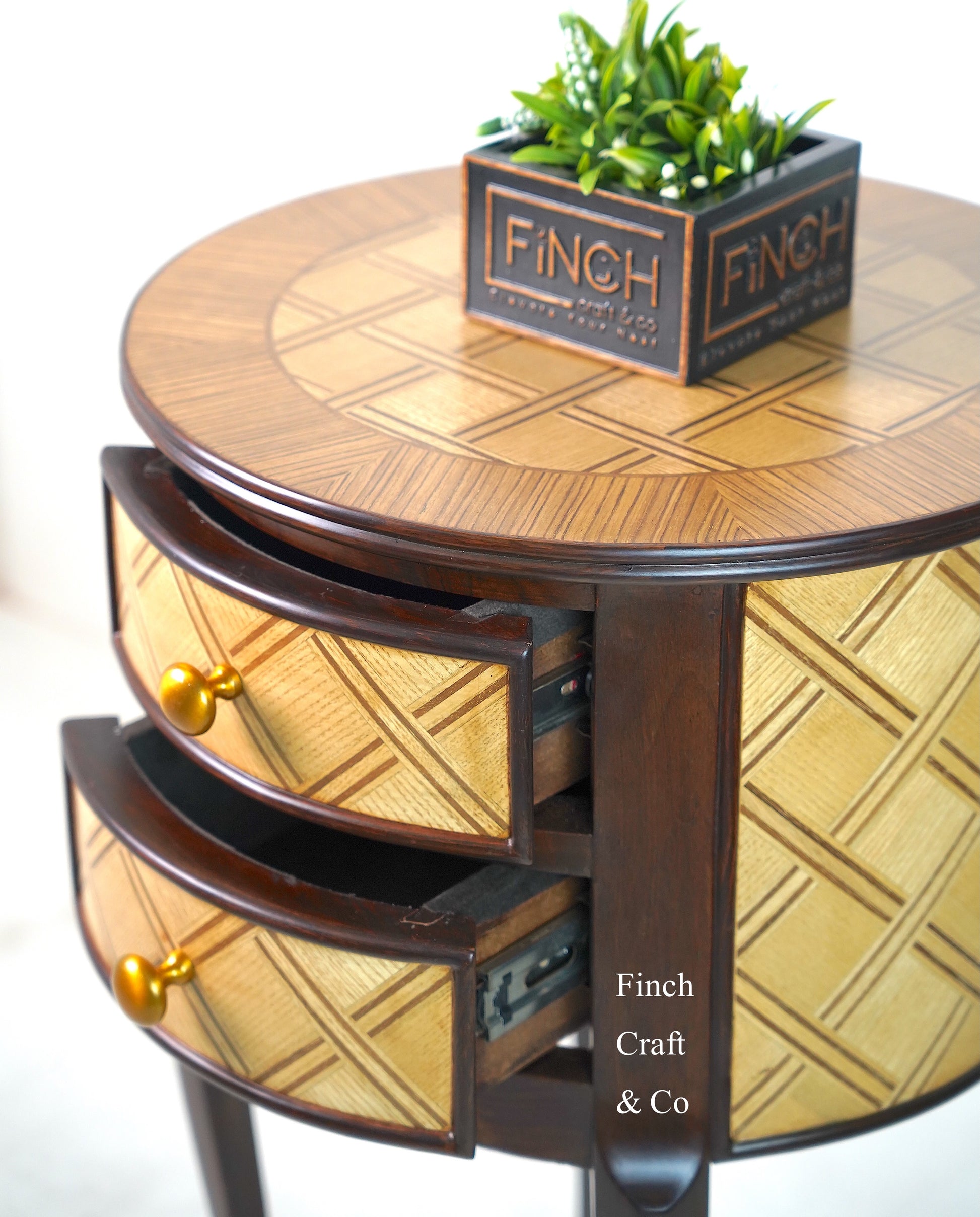 Round table with dual drawers and ash veneer marquetry, ideal as a side table, night stand, lobby accent, or hallway décor piece.