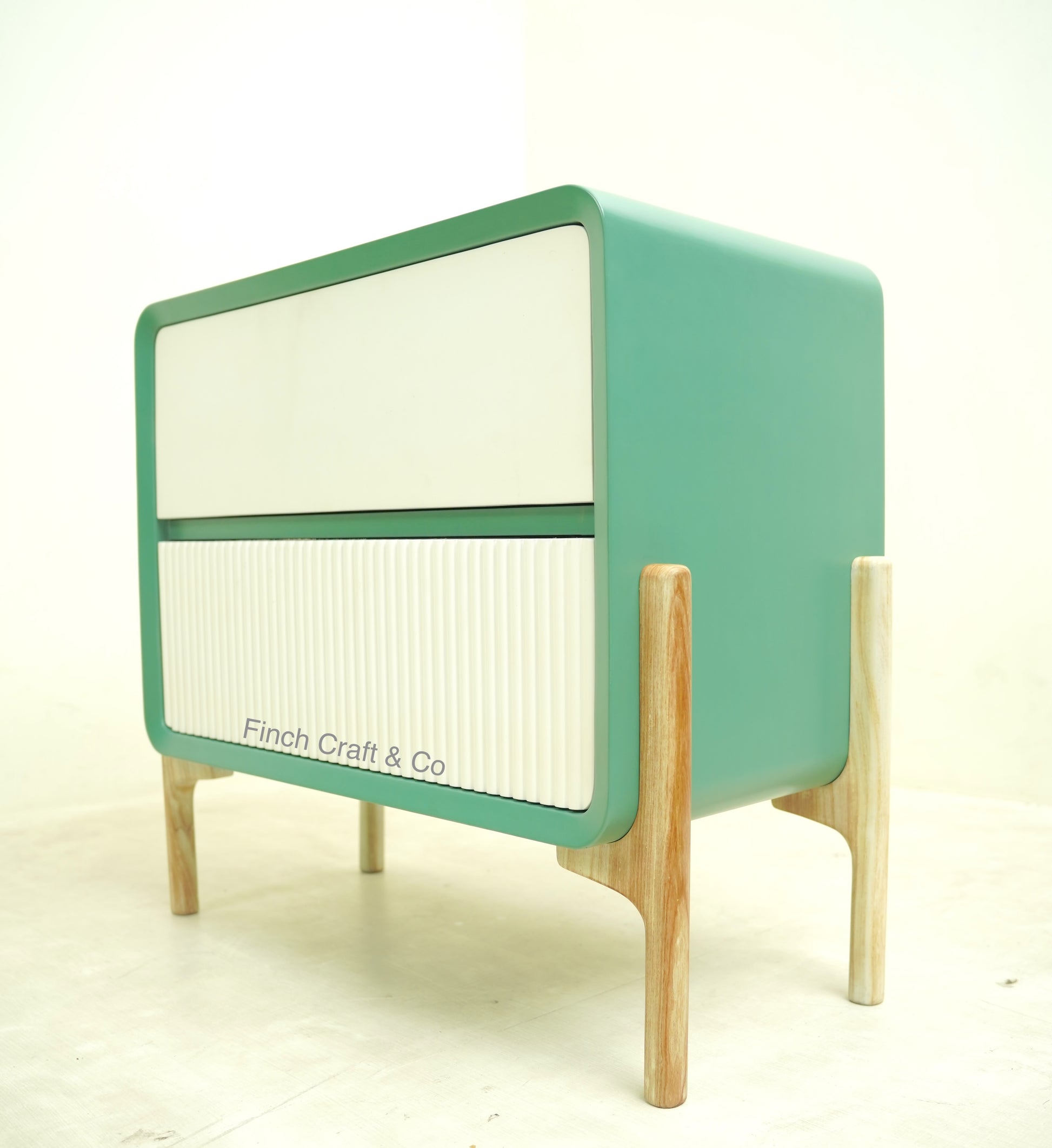 Emerald green matte body paired with white drawers creates a bold, contemporary visual contrast.