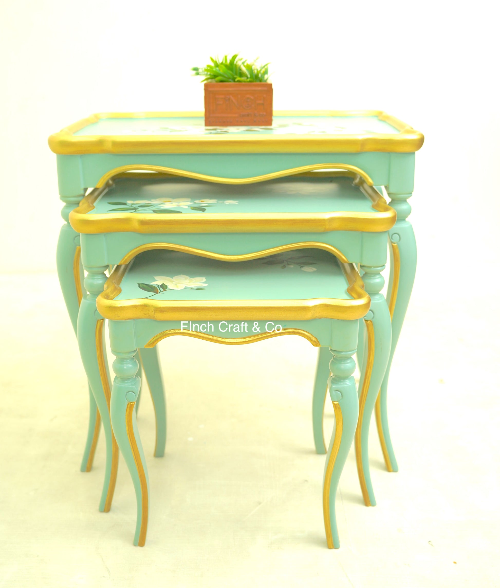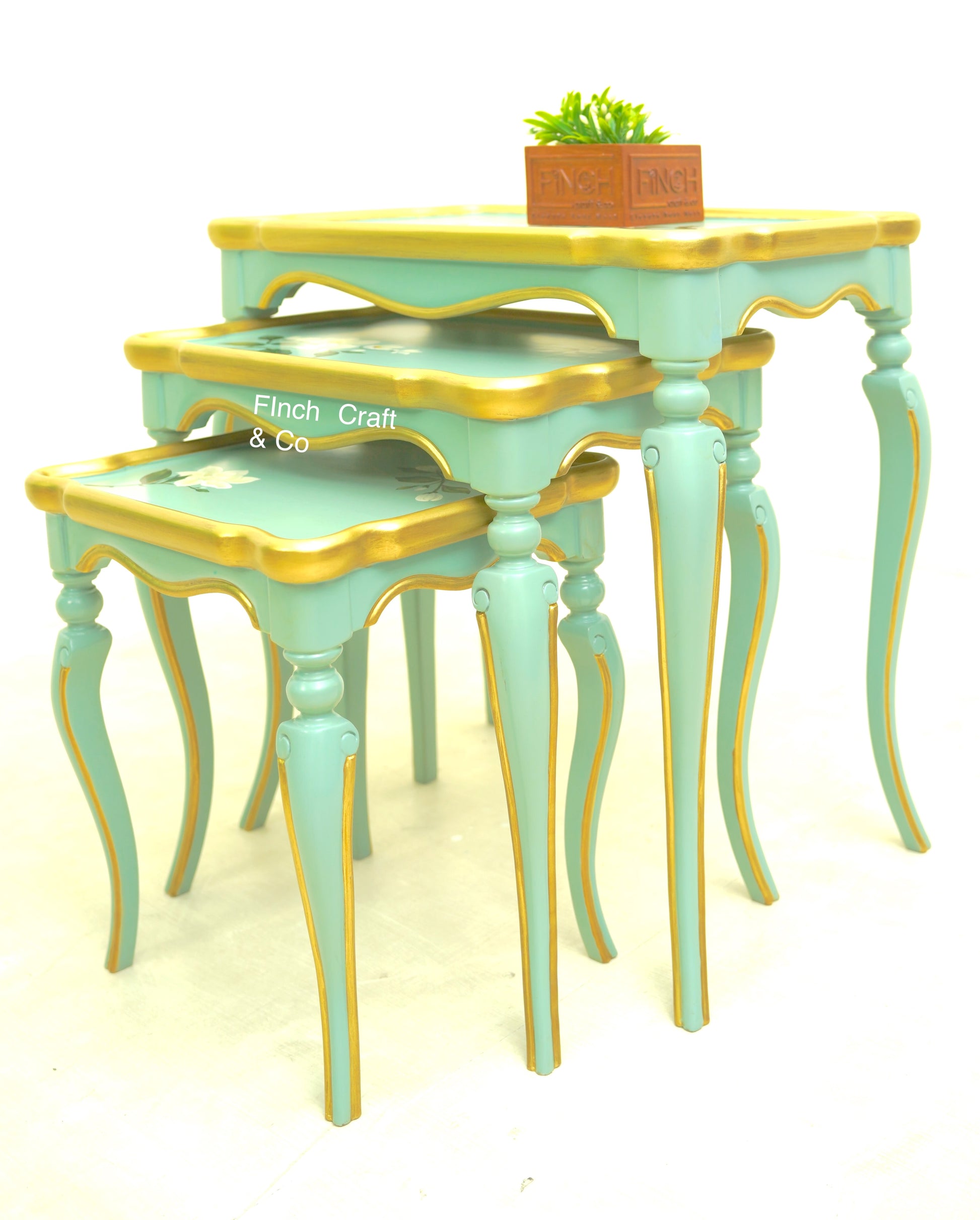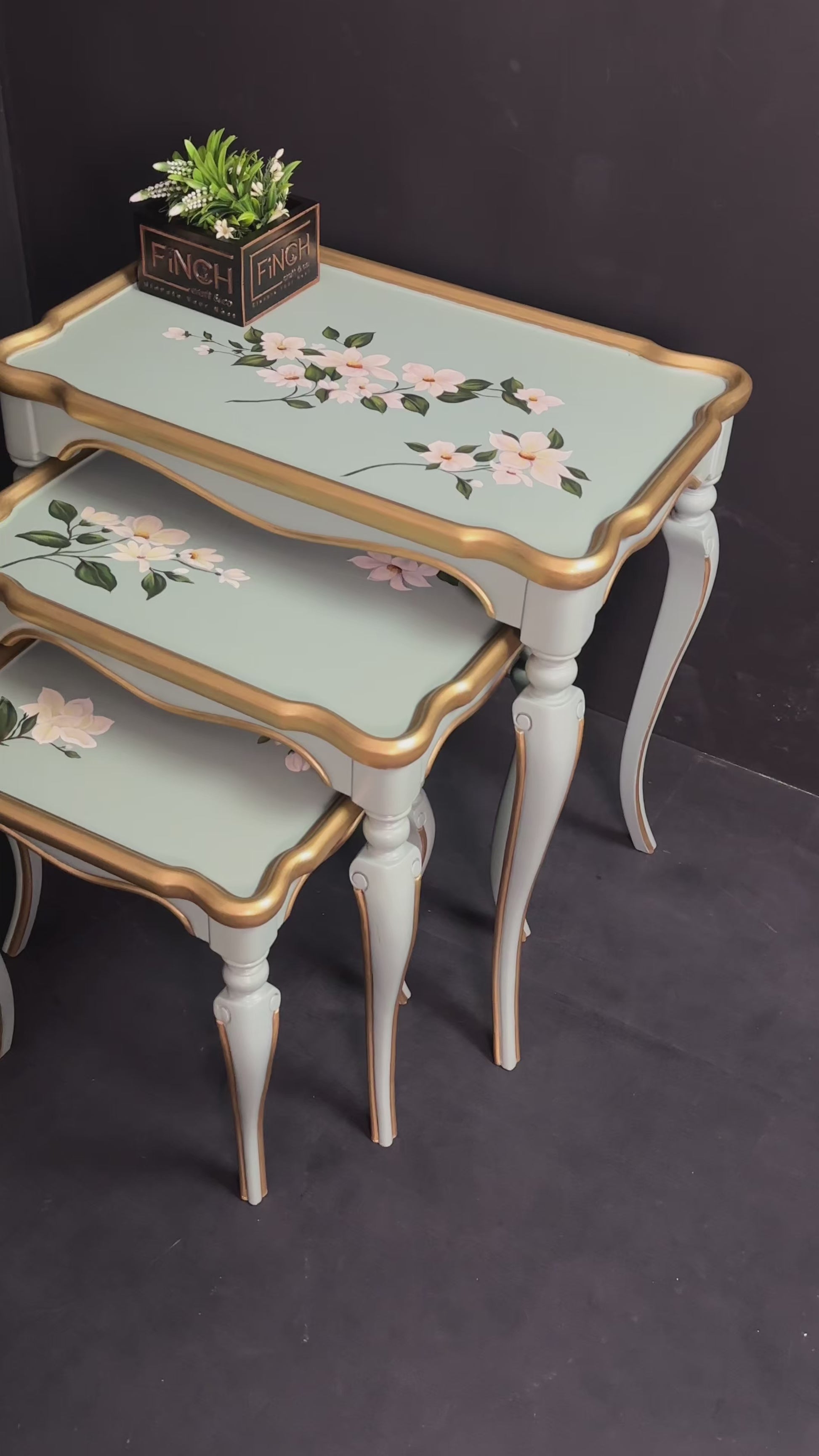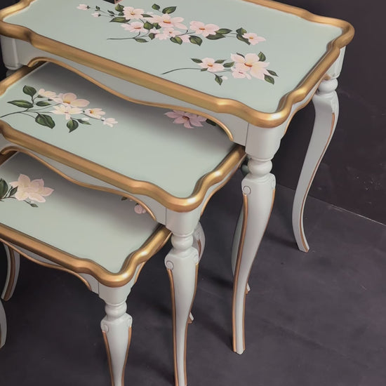Victorian nesting table set with hand-painted floral tops and refined green-gold detailing.