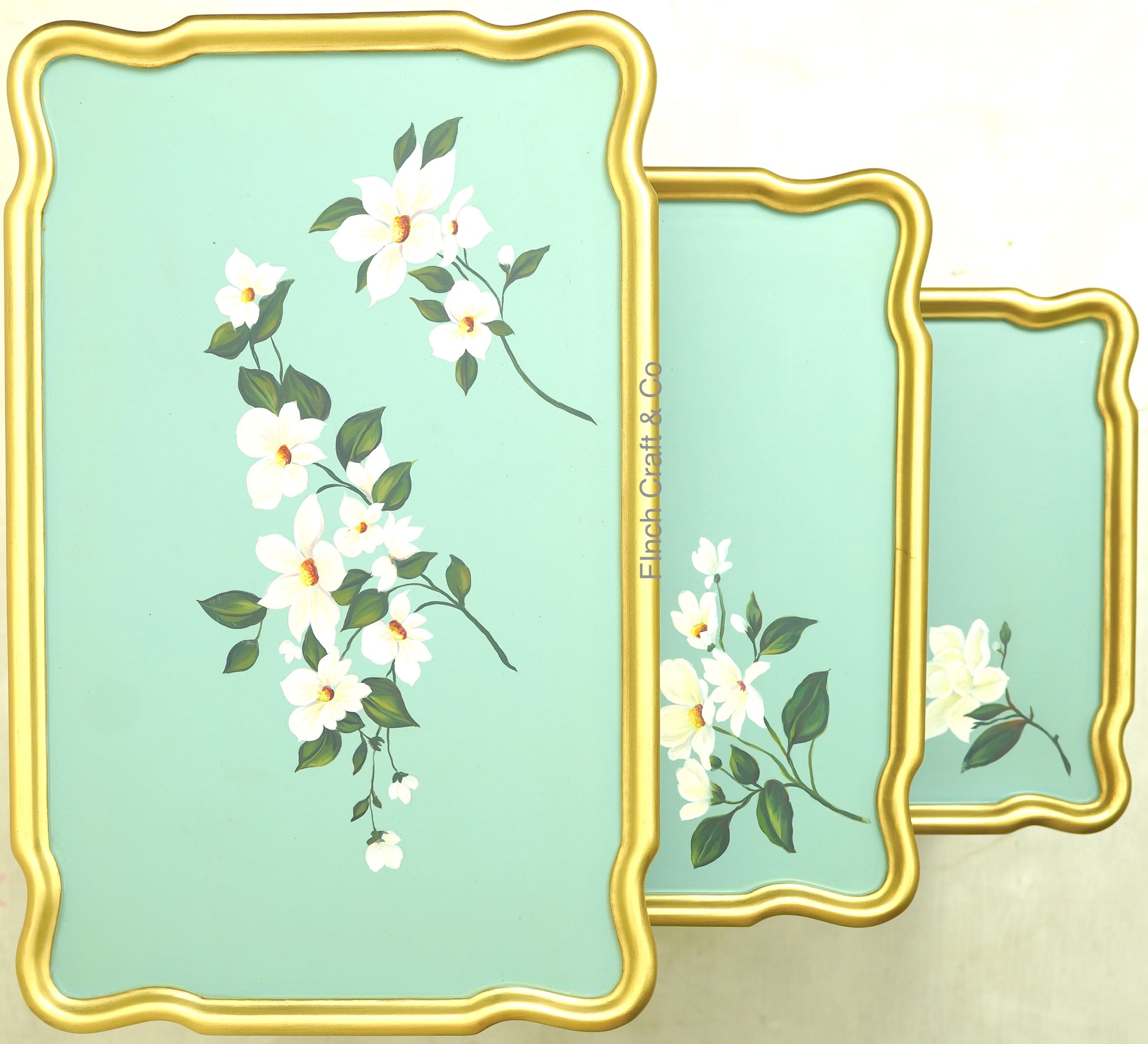Tray-Style Curvy Tops: Decorative tray-style tops with soft curves, enhanced by hand-painted green-gold molding.