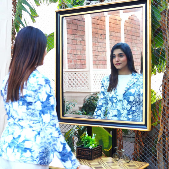 Matte black frame with beveled glass for a sleek, modern look.