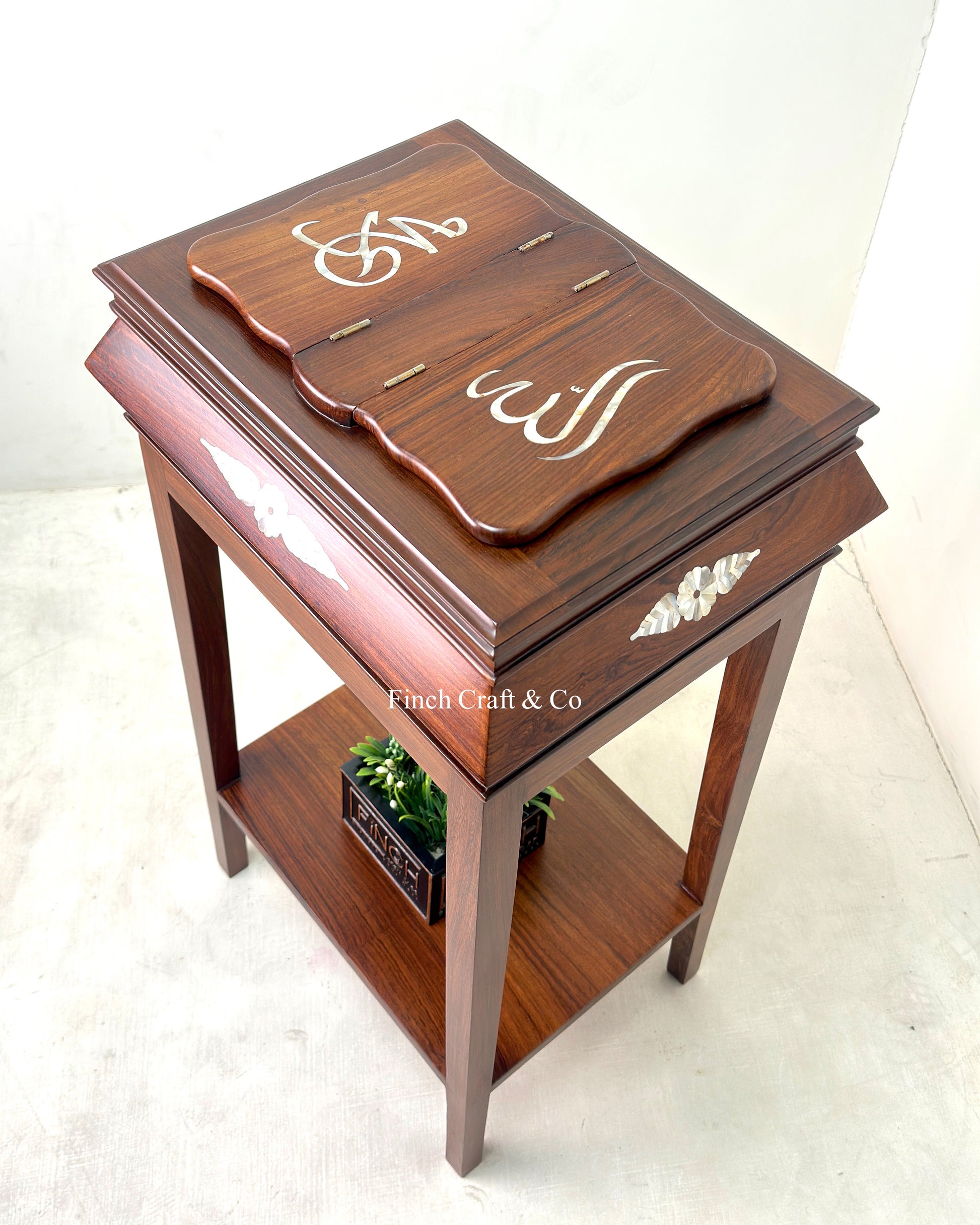 Functions as both a Quran stand (rehal) and a decorative Islamic art piece