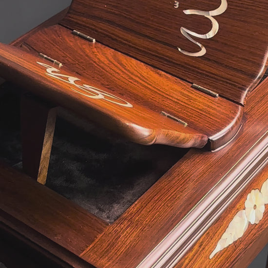 Avoid exposure to water, moisture, or high humidity to protect the wood and mother of pearl inlay.